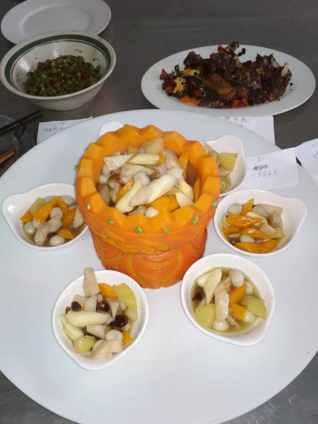 洛阳市职业技能鉴定所于2018年3月20日至22日在高新校区组织安排了鉴定考试,我院东方文化创产学院2015级中式烹调专业43名毕业生参加,洛阳市人力资源和社会保障局职业技能鉴定指导中心主任张自彦、詹阳锋一行亲临现场指导,对考生组织、理论、实操过程以及参考人员的菜品进行了肯定。