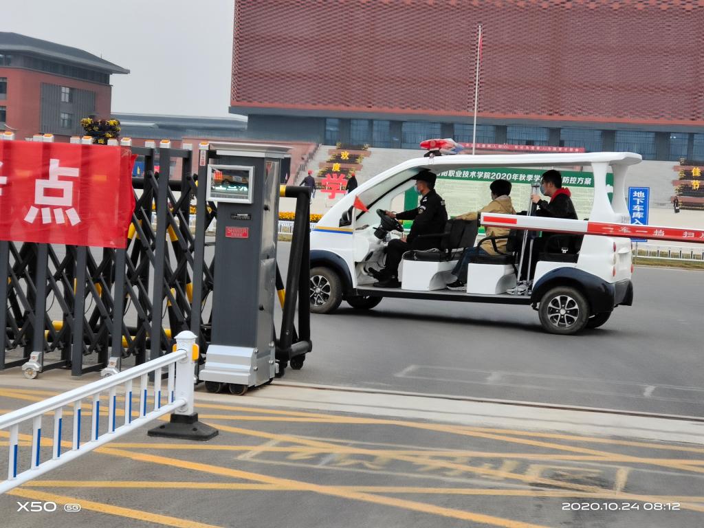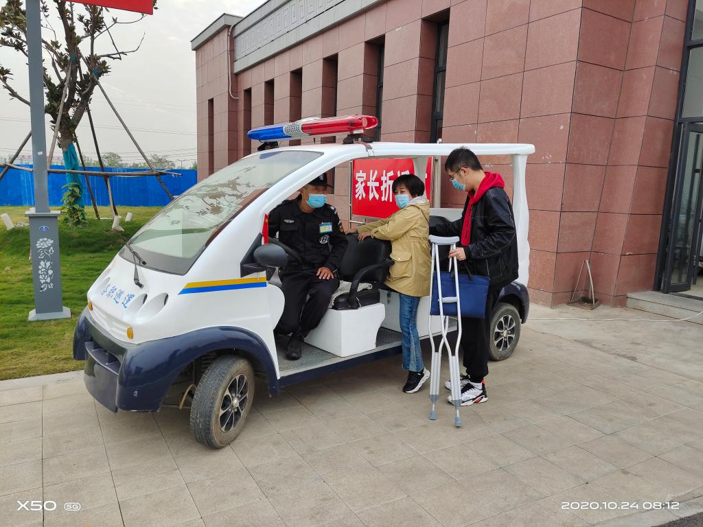 考生入场检测时,遇到身体不便的考生,工作人员安排校车把考生送到考场。