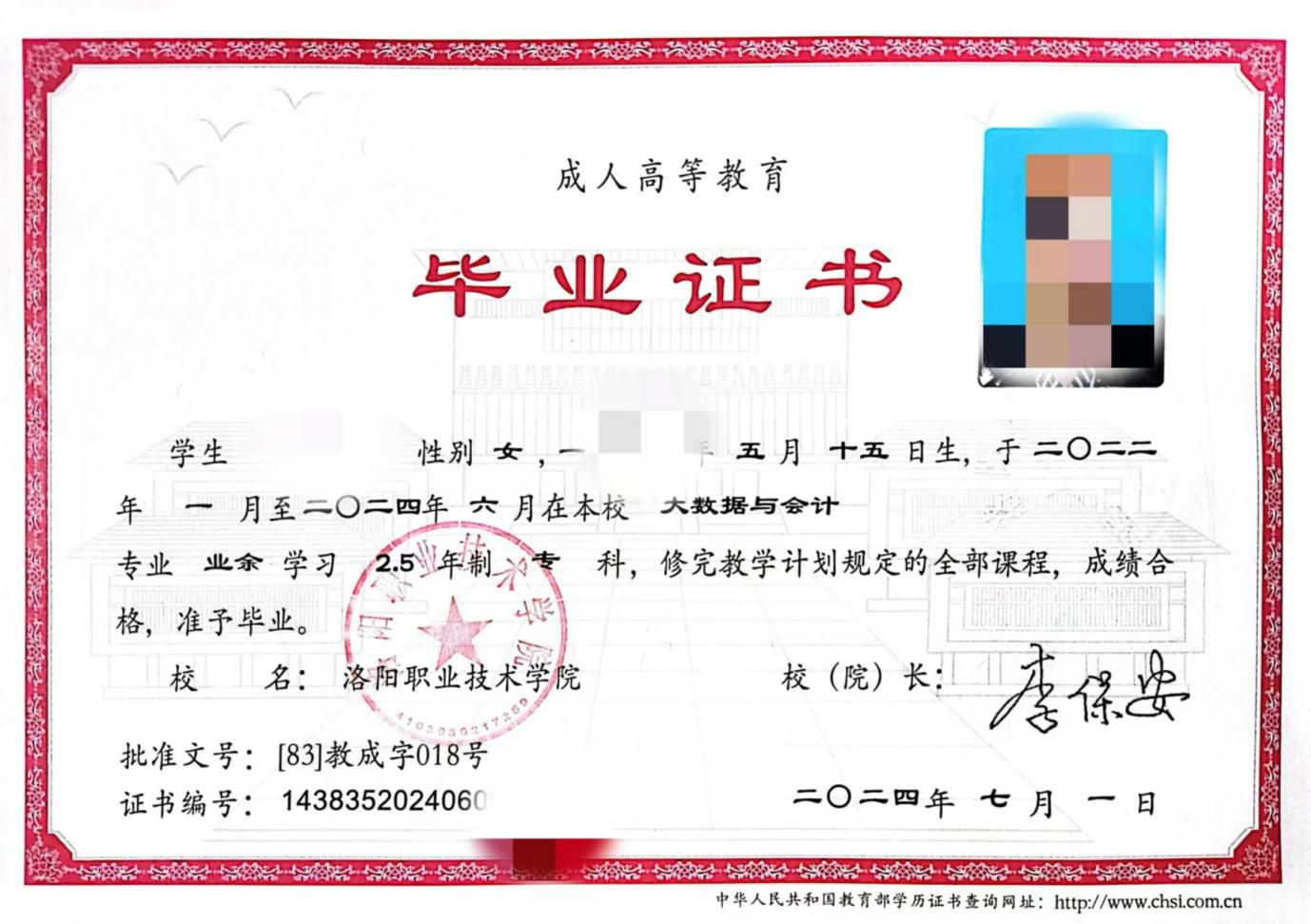 学生在规定学制年限内,完成各项学习任务,达到毕业要求的,准予毕业。颁发洛阳职业技术学院成人高等教育毕业证书。毕业证书信息可在教育部中国高等教育学生信息网(www.chsi.com.cn)查询。
